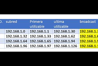 Para el broadcast se suma 1 a la última utilizable192.168.1.30 + 1 = 192.168.1.31 y así en cada línea