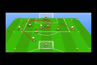 Realización: en un campo de 40x20m, se realizara un 4×4 con 4 porterías pequeñas de 1x1m. Se conseguirá un punto conduciendo el balón y entrando por la línea de meta. Los defensas deberán realiza correctamente las basculaciones a la hora de defender. Dos toques máximos. Continuos cambios de orientación del juego de ataque.
