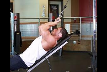 Acuéstese sobre un banco plano inclinado de espaldas a una máquina de polea alta. Sujete la barra por encima de la cabeza, las palmas hacia abajo, agarre estrecho, menos que el ancho del hombro y mantenga los codos pegados a los costados. Los brazos deben crear un ángulo de 25 grados cuando se mide desde el piso. Mantener los brazos fijos, extender los brazos cuando flexiona el tríceps. Exhale durante esta porción del movimiento y mantener la contracción durante un segundo. Poco a poco volver a la posición inicial. Repita el procedimiento para la cantidad recomendada de repeticiones.