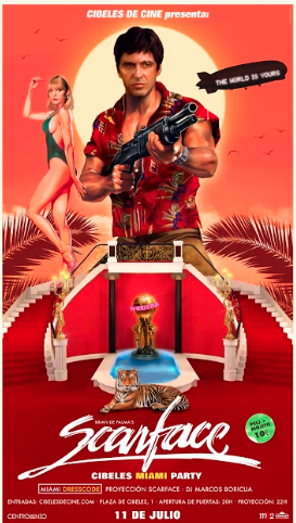 Cibeles Miami Party comenzará a las 20h con música de los 80 a cargo del DJ Marcos Boricua y a las 22h se proyectará Scarface. Desde Cibeles de Cine se anima a los asistentes a acudir con un dress-code tropical: camisas hawaianas, viseras, bodies, gorras, shorts… Cualquier prenda que recuerde el más puro estilo Miami Beach.