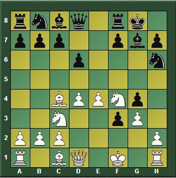 [11...c6 12.Ch5 Af8 13.h3 Cg8= Komodo]12.h3Pidiendo ya explicaciones al par de peones avanzados al tiempo que abre la columna "h", pero este plan encontrará una manera muy original de Zukertort de crear contrajuego.[12.Ch5!? es interesante pues lleva la idea de intentar ganar una pieza con 13. Dd2. 12...Rh8 13.h3= Komodo(13.Ae3 Cc6 14.Cxg7(14.Dd2?Komodo14...Cg8con idea de ...f7-f5 con contrajuego. Neishtadt15.Rg1 f5 16.Cxg7 Rxg7 17.Ag5 De8 18.h3 gxh3 19.Txh3 fxe4=/+Komodo)14...Rxg7 15.Cd5 Cg8 16.h3 Cce7 17.Cxe7 Dxe7 18.hxg4 Axg4 19.Dd2= Komodo) ]12...Cc6 13.Ch5Defendiendo el peón de "d4" de forma indirecta.13...gxh3 14.Cd5[14.Cxg7 Rxg7 15.Axh6+ Rxh6 16.Dxf3 Rg7-/+ Komodo]14...Cg4 15.c3 Ce7[15...Ca5!? 16.Ad3 f5 17.Cxg7 Rxg7 18.exf5 Axf5 19.Axf5 Txf5 20.Cf4= Komodo]16.Cdf4¡A por el peón de "h3" para abrir la columna!.[16.Dxf3 Cxd5 17.Axd5 c6= Komodo; aunque para Neishtadt la posición es incierta al contar las negras con la idea de ...h3-h2. Veamos: 18.Ab3 h2 19.Rg2 a5 20.a4 c5 21.Ad1 De7 22.Cxg7 Rxg7 23.Df4 f5 24.Axg4 fxg4 25.Dg5+ Dxg5 26.Axg5 Te8 27.The1= Komodo]16...Cg6 17.Cxh3 Ae6 18.Axe6Erradicando ya de lleno permitir jugar cuando convenga ...f7-f5.18...fxe6 19.Cg5!?Diagram