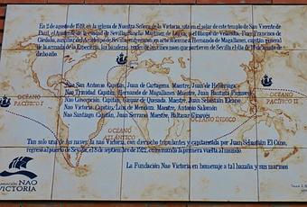 Sobre la fachada principal de la Iglesia de San Vicente de Paul, frente al monumento a Rodrigo de Triana, nos encontramos con esta azulejo con el que laFundación NAO VICTORIA da homenaje a la hazaña del primer viaje de circunvalación de la tierra empezada por Magallanes y finalizada por Elcano.