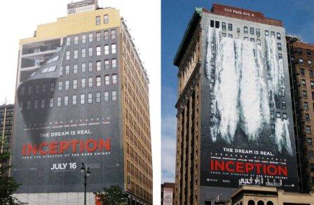 El 25 de agosto pasado publiqué unas imágenes en las que se ve la transformación de la fachada de un edificio gracias a una proyección que se hace sobre ella, ahora pongo unas fotografías -se las "robé" a Andres Daly de su facebook- menos impactantes, pero que también tienen mucho que ver con la relación entre realidad y ficción, teniendo en cuenta además que, como la proyección antes mencionada, son parte de una campaña publicitaria, en este caso de Origen, como se ha titulado en España la inquietante película de Christopher Nolan, en la que también se juega con la realidad y la ficción, en realidad esta vez esa que vivimos todas las noches, algunos con mucha intensidad, la de los sueños. Por cierto, que la ciudad que aparece al final de esta película tiene mucho interés y ya estoy escribiendo un artículo sobre ella y otras similares y cinematográficas en un artículo para una revista.