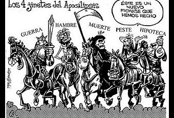 Los efectos de la crisis económica están llegando a extremos realmente espeluznantes. Os resumo un caso real: chaval que montó una empresa, tenía problemas de financiación, consiguió que el Banco le diese crédito a cambio de que sus padres hipotecase su casa en garantía; los padres, jubilados y enfermos, le ayudaron, el chico no ha conseguido superar la falta de pedidos y los impagados, el Banco ha ejecutado la hipoteca, llegan las notificaciones a casa de los padres pero no entienden nada, dentro de un par de días se subastará su casa, ...La historia, con unos u otros matices, se repite a lo largo de toda la geografía. Cuando al final los padres deciden acudir a un abogado ya es demasiado tarde. Pero lo intentamos: nos vamos a hablar con el Juez para que suspenda la subasta y de tiempo a los padres a buscar 30.000 € (el piso vale 180.000). No podemos hacer nada, el Juez dice que sólo la suspenderá si el Banco lo pide y el Banco dice que le tienen que pagar las cuotas adeudadas. Un dilema.