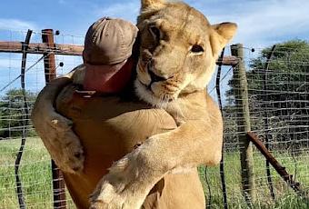 Sirga a Valentín Gruener, el ecologista que la rescató, se abraza a Sirga. Primero fue un cocodrilo vegetariano amigo de unos monjes quien dejó a medio mundo atónito con su peculiar y peligrosa amistad. Ahora ha sido una leona la que se ha ganado el cariño y la sorpresa de las redes sociales con sus continuas demostraciones de afecto hacia su cuidador, el ecologista Valentín Gruener. Su amistad con la leona empezó cuando Sirga, era tan solo una cachorra. Valentín la salvó con unos pocos días de vida cuando su madre se negó a alimentarla y se quedó deshidratada a punto de morir. Desde entonces, Valentín ha cuidado de ella y ambos se han hecho inseparables. Y la leona está tan agradecida que nunca le ha hecho daño a su cuidador, todo lo contrario, le abraza continuamente y le da cariño.