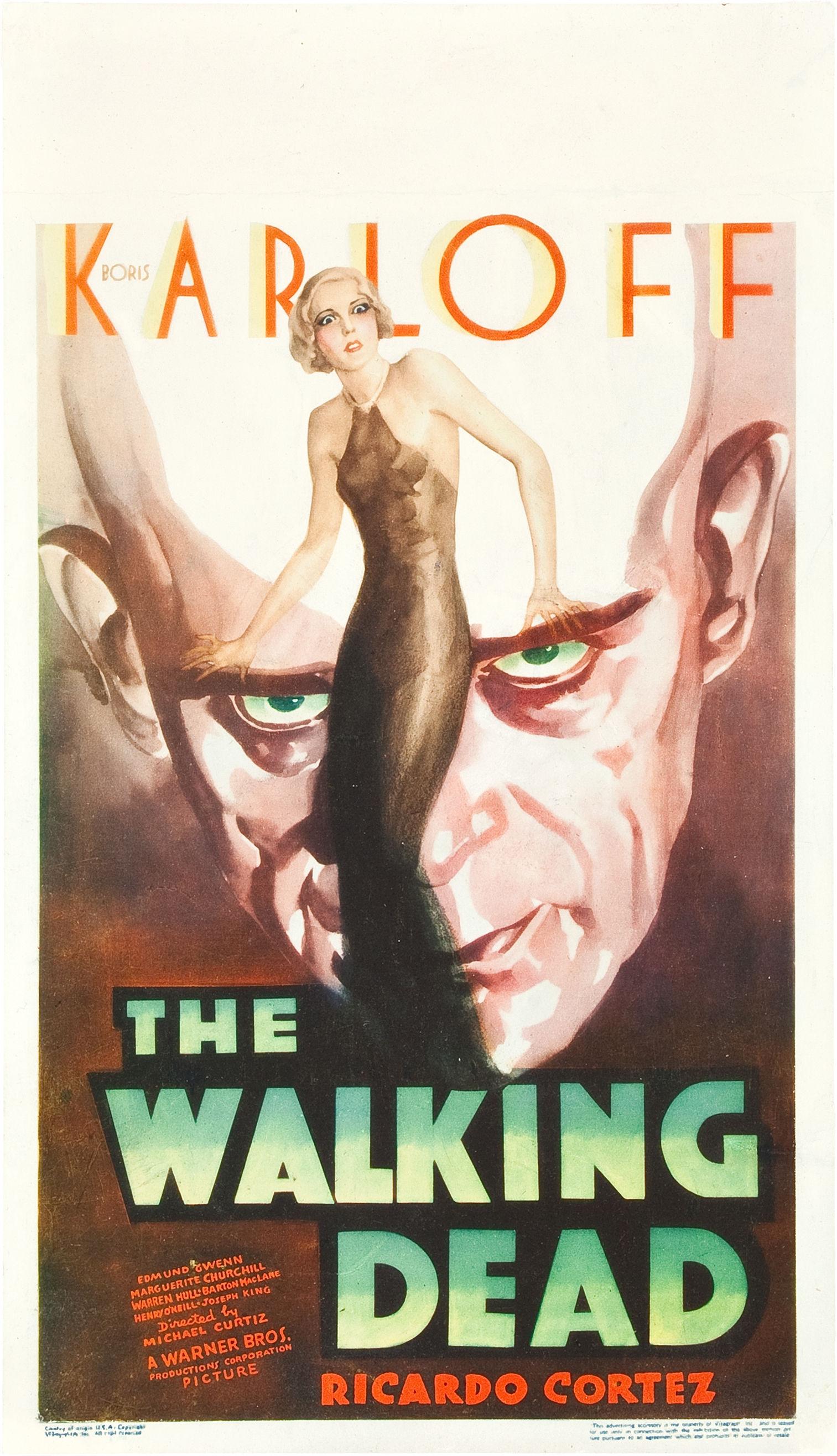 The Walking Dead (Warner Brothers, 1936), tarjeta postal en venta en Heritage Comics (8 a 10 mil dólares precio base), basado en la cinta estelarizada por Boris Karloff y dirigida por Michael Curtiz.