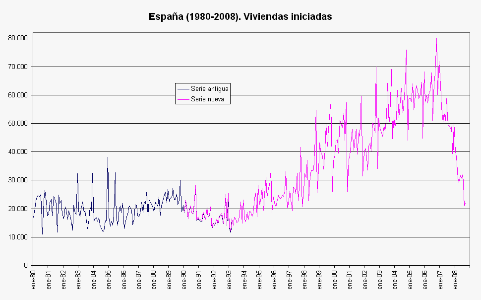 Número de viviendas iniciadas anualmente en España. 1980-2008Este panorama previo de la profesión nos lleva al contexto actual de la arquitectura española que es un reflejo del fuerte deterioro de la situación económica que vive el país en su conjunto. El fulgurante crecimiento del Producto Interior Bruto español en la última etapa de la democracia ha estado muy ligado al desarrollo masivo del sector inmobiliario, apoyado en una financiación barata otorgada por el sector bancario. Ello ha dado lugar a unas periferias urbanas que han adquirido una extensión descomunal y unos territorios costeros devastados por masivas actuaciones especulativas. Es, por ejemplo, el caso del arco de la ribera del mediterráneo, una auténtica megalópolis conformada por una estrecha y continua banda urbanizada de cientos de kilómetros.Todo un excedente especulativo que se va a tardar en liquidar bastantes años haciendo con ello redundante la enorme capacidad productiva del sector de la construcción, la industria auxiliar y los servicios técnicos asociados. Ello agravado con el problema financiero que sufren las entidades bancarias, que tienen que cubrir como sea las mermas patrimoniales que ha supuesto la increíble disminución del valor de sus activos. Todo un efecto consecuente con la reducción real sufrida en los precios de los productos inmobiliarios avalados. Hasta el momento, las entidades bancarias han sido incapaces de trasladar esta perdida a sus cuentas manteniendo unos valores contables ficticios, año tras año en sus balances patrimoniales. La consecuencia más evidente de este grave problema financiero es la fuerte restricción del crédito inmobiliario y con ello la práctica detención de la producción de viviendas.La realidad es que, en el conjunto de las principales regiones españolas, las necesidades sociales de arquitectura han variado radicalmente en un periodo temporal muy corto, de escasos tres años. Hoy en día existe un excesivo número de profesionales en oferta y una demanda reducida a una mísera parte de la que existía hace poco tiempo. Una crisis colectiva que permanece invisible para una sociedad insensible a los problemas de este gremio de profesionales, a los que estigmatiza como responsables de muchos desaguisados y a los que identifica como personajes siempre relacionados con múltiples casos de corrupción colectiva. Lo cierto es que hoy los arquitectos españoles pertenecemos a un gremio extremadamente depauperado, con escasos visos de volver a acceder a un mercado de trabajo intenso en recursos humanos. Es necesario pasar urgentemente a transmitir esta realidad profesional y contribuir a establecer los mecanismos para recuperar unas mínimas perspectivas de supervivencia, igual que les debe estar ocurriendo a otros también ligados al sector de la construcción. En esta situación, la deteriorada forma en que se accede al escaso trabajo profesional se convierte en un elemento crucial sobre la que se debe reflexionar y debatir colectivamente.
