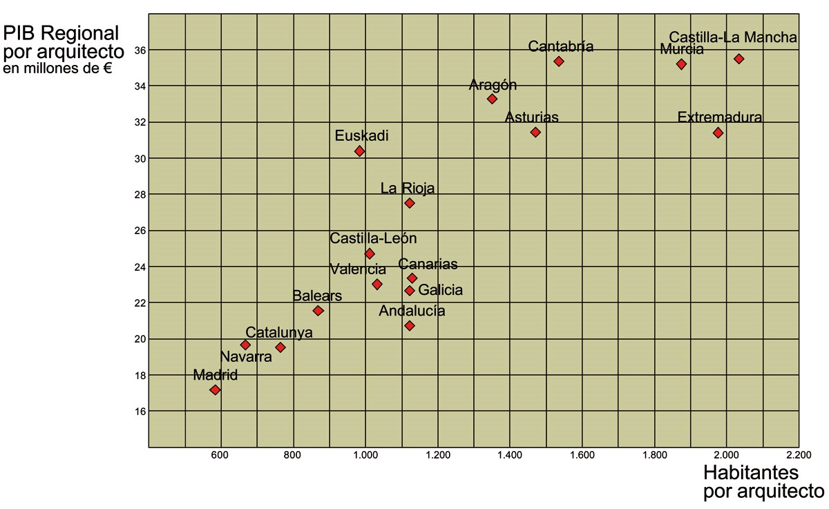 Número de arquitectos por 1000 habitantes en cada comunidad autónoma españolaEn base a esa prefiguración casi se podría establecer que el punto de equilibrio podría estar en 0,8 arquitectos por habitante, como cifra optima de profesionales en un país con la estructura y condiciones de los europeos. He querido hacer un ejercicio parecido en lo que se refiere a las distintas comunidades autónomas del estado español, relacionando población y número de arquitectos junto a la relación entre arquitectos y millones de €uros de PIB regional disponibles, tomando como referencia el año 2007. Un análisis de los resultados no deja de ser sorprendente de los lugares más favorables al desarrollo de esta profesión y, al mismo tiempo, concluyente sobre las razones del fuerte deterioro que existe en las grandes ciudades en las que la posición de los arquitectos se enfrenta a una competitividad autodestructiva.Madrid, Navarra y Cataluña serían los lugares más problemáticos para establecer una práctica razonable de la arquitectura, mientras que Murcia y Extremadura podrían ser los más benignos. Algo similar podría ocurrir en Castilla La Mancha sobre la que se podría presumir que es, no obstante, una región técnicamente dependiente de la capital. Otras zonas privilegiadas serían Cantabria, Aragón y Asturias mientras que el resto formaría un grupo compacto de comunidades en las que se podría haber percibido atenuadamente el deterioro en la rentabilidad de la arquitectura mucho antes de que llegara la actual crisis.
