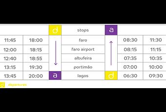 - Frecuencias: Tiene 3 salidas diarias y dependiendo de tu destino durará más o menos (Aeropuerto-Faro: 15 minutos; Aeropuerto-Albufeira:40 minutos; Aeropuerto-Portimão: 75 minutos; y del Aeropuerto-Lagos: 105 minutos)