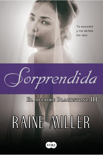 Título: Sorprendida.Título original: Eyes wide open.Autora: Raine Miller.Editorial: Suma de Letras.Páginas: 400Encuadernación: Rústica con solapas.Precio: 15'00€ (A la venta el 25/09/2013) || 6'99€ (Ya disponible en formato digital)ISBN: 9788483651155Sinopsis: ¡¡ATENCIÓN!! La sinopsis puede contener spoilers de los anteriores libros.Todo tiene un final, y tu no querrás que termine. Grandes sorpresas les aguardan a Ethan y Brynne mientras intentan hacer frente a lo que les ha deparado la vida. Los demonios del pasado amenazan con destrozar la apasionada relación que han construido, a pesar de que se juraron que nada les separaría. Una pérdida, devastadora y terrible, sumada a la posibilidad de un nuevo futuro les abre los ojos y les hace ver lo que es realmente importante pero, ¿podrá esta pareja de enamorados seguir adelante y dejar atrás las dolorosas historias los persiguen? Un acosador sigue merodeando entre las sombras, tramando una conspiración aprovechando el ajetreo y la distracción de los Juegos Olímpicos de Londres 2012. Brynne y Ethan están a punto de perderlo todo a medida que aumenta la situación de peligro. ¿Se verán superados por las circunstancias o lucharán con las escasas fuerzas que les quedan para salvarse el uno al otro y ganar el mejor premio del mundo: una vida juntos? Sorprendida es una historia forjada en la pasión que nos demuestra lo que el amor verdadero puede lograr cuando se pone a prueba y lo que el corazón puede conseguir a pesar del miedo y de la adversidad. Trilogía El Affaire Blackstone:#1. Desnuda. #2. Todo o nada.#3. Sorprendida.Opinión personal:Eran algo más que ganas las que tenía de leer el desenlace de esta trilogía, sobre todo después del final del segundo libro. ¿Qué pasaría con Brynne y con Ethan? ¿Conseguirían que su relación tuviera un futuro? ¿Se sincerarían el uno con el otro, o seguirían manteniendo secretos? Y lo más importantes, ¿qué sucederá con el acosador de Brynne? Eran muchas las incógnitas que rondaban mi cabeza, así que en cuanto pude, devoré el tan ansiado final sin piedad alguna.