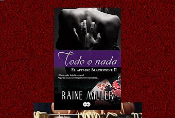 Título: Todo o nada.Título original: All in.Autora: Raine Miller.Editorial: Suma de Letras.Páginas: 350Encuadernación: Rústica con solapas.Precio: 15'00€ISBN: 9788483650950Sinopsis:Ethan Blackstone tiene un serio problema. Acaba de romper la confianza de Brynne y ella lo ha dejado. Sin embargo, no está dispuesto a darse por vencido, no va a rendirse; hará todo lo que pueda para recuperar a su preciosa chica americana. La pasión entre ellos es abrasadora pero los secretos que se esconden el uno al otro son muy dolorosos y lo suficientemente serios como para acabar con la posibilidad de una vida juntos.Además, debido a las amenazas políticas que ahora caen sobre Brynne, Ethan tiene poco tiempo para reaccionar y ha de reunir toda su fuerza y habilidad para protegerla de los peligros que pueden apartarla de su lado para siempre. ¿Será capaz Ethan de liberar a Brynne de un pasado que la sigue atemorizando? ¿Volverá a sentir el calor de su piel, a recuperar su confianza de nuevo? Esta es la historia de un hombre enamorado que hará cualquier cosa para poseer el corazón de la mujer que ama. Y que llegará hasta donde sea para protegerla. Todo o nada.Una novela apasionante que habla de lo que sucede cuando dos personas se encuentran y se rinden a un amor tan fuerte que es capaz de curar las heridas del pasado y de dar paso a una vida de pura y completa felicidad.Trilogía El Affaire Blackstone:#1. Desnuda. #2. Todo o nada.#3. Sorprendida.