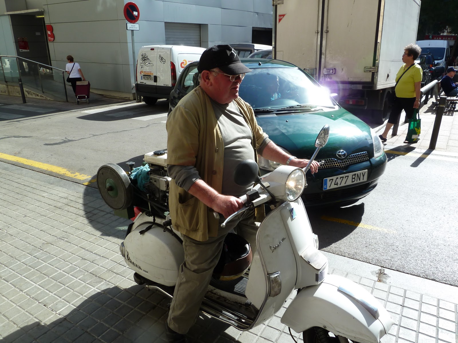 El otro día, mientras trabajaba plácidamente en la cueva (trabajo en un sótano al que llamamos así por sus similitudes), escuché la armónica del afilador y de pronto me ví corriendo tras él para inmortalizar el momento. Lo conseguí, llegué con la lengua fuera pero lo conseguí justo delante del Mercat de Sant Gervasi. En otra época, no me hubiera hecho falta correr para alcanzarlo, porque los dueños de bares, restaurantes, carnicerías... salían a su llamada para afilar sus utensilios de cocina.