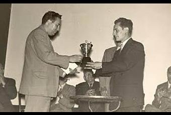 Miquel Albareda recibiendo el trofeo de campeón de manos de Joan Barnola