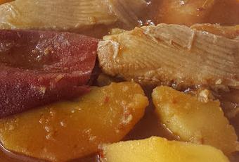 1 kg de raya (que os la pelen porque la piel es muy dura) cortada en trozos en el sentido de los cartílagos (se puede usar bacalao desalado)1 kg patatas2 pimientos ñoras o un pimiento choricero2 cucharadas de pimentón molido2 tomates maduros2 dientes de ajo1 vasito de aceite de oliva virgen extra.3 litros de agua (o la suficiente para que cubra las patatas un dedo)AzafránCominosPerejil y sal.