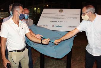 El alcalde de Ponferrada, Olegario Ramón, acompañado de la concejala de Infraestructuras, Carmen Doel, y de otros miembros de la Corporación Municipal, inauguró hoy el monolito de vidrio instalado en la glorieta de acceso a la entrada