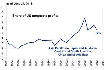 Uno de los factores clave de mi escenario macro de largo plazo son los márgenes de los beneficios corporativos en EEUU (Margin Profits), tal y como vengo comentando (ver último post al respecto aquí). Hoy me ha pasado Ángel Martín Oro a través de su interesante Tweet Line (@a_martinoro) este gráfico (ver más abajo) que muestra la ridícula aportación de los emergentes al beneficio de las empresas americanas (SP500 y extrapolable al resto). Podéis ver el artículo completo aquí.
