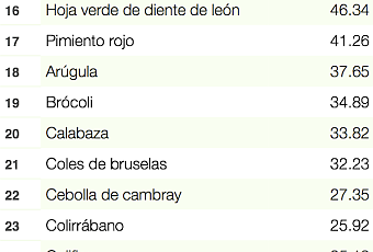 En un estudio realizado en la Universidad William Patterson de Nueva Jersey, hicieron un análisis de diferentes alimentos para poder clasificarlos según su contenido nutrimental. Compararon 100 gramos de diferentes alimentos según su cantidad en 17 nutrimentos: Potasio, Fibra, Proteína, Calcio, Hierro, Tiamina, Riboflavina, Niacina, Folato, Zinc y Vitaminas A, B6, B12, C, D, E y K. Les dejo la lista con las primeras 41 que publicaron (al parecer tenemos que empezar a consumir berro seguido):
