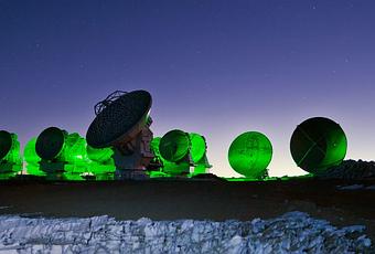 Sentado entre el paisaje ajeno a la dureza de Atacama y las antenas del ALMA, se ve un extraño mundo bañado en una luz verde neón. Ésta luz es en realidad una función incorporada de ALMA. La matriz de antenas tienen una luz verde intermitente que parpadea periódicamente mientras que las antenas están en funcionamiento, que no perturba las observaciones de longitud de onda de radio. Esta luz no es tan visible como en la imagen capturada con una exposición de 10 segundos, tiempo durante el que se produjo un destello verde y se extendió por toda la imagen, creando un fuerte contraste entre el verde de las antenas y el profundo azul del cielo nocturno.