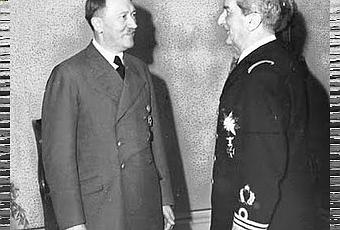 Miklos Horthy con el Führer. También están presentes un oficial de las Waffen SS y otro oficial húngaro.Precisamente uno de los temas que Horthy ha querido sacar a colación ante el Führer durante las entrevistas ha sido la retirada de dicho Cuerpo del Frente y su regreso a Hungría. Horthy ha obtenido la aprobación del Führer a cambio de que Hungría proporcione cierto número de “unidades de ocupación” que se puedan hacer cargo de la retaguardia del frente alemán y aseguren sus líneas de comunicaciones y transporte ante la creciente actividad partisana.
