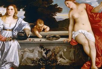 El extraordinario pintor renacentista Tiziano se atrevió sin embargo, en 1516, a pintar un cuadro al que tituló El Amor Sacro y el Amor Profano. Es esta creación muy significativa para entender lo que este magnífico período en el Arte pudo lograr expresar con el Amor en una obra. Un total caos interpretativo. El amor sacro frente al amor profano, es decir, ¿es que había -hay- dos clases de amor? La representación de una escena -típicamente renacentista- sitúa a dos grandes personajes separados por el impenitente Cupido. La mujer vestida, doncella y pura, es precisamente el Amor Profano. La mujer desnuda, divina y promiscua -la diosa Venus griega-, es la que representaría al Amor Sacro. ¿Hay mayor contradicción? Pero, lógicamente, todo esto es una alegoría; es decir, una interpretación diferente -renacentista pura- de lo que el cuadro vívamente representa.