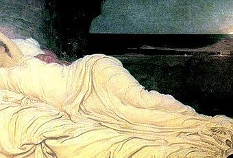 (Cuadro del pintor británico, prerrafaelista, Frederic Leighton (1830-1896), Cimón e Ifigenia, 1884, Galería de Arte de Sidney; Óleo de Giovanni Tiépolo, Martirio de Santa Águeda, 1750, Berlín; Grabado con la imagen del pintor Tiépolo; Fotografía del pintor Frederic Leighton; Cuadro del pintor inglés Waterhouse, El Decamerón, 1916, Liverpool.)