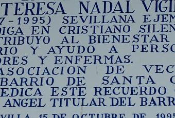"En esta casa vivió Teresa Nadal Vigil (1957-1995) sevillana ejemplar pródiga en cristiano silencio. Contribuyó al bienestar del barrio y ayudó a personas mayores y enfermas. La Asociación de Vecinos del Barrio de Santa Cruz le dedica este recuerdo como el ángel titular del barrio. Sevilla 15 de octubre de 1995".