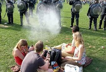 La nube blanca que ven es el gas pimienta usado por los policías, siervos cómplices de los tiranos del Nuevo Orden Mundial, contra un pacífico grupo de jóvenes que respiraban aire libre sin la inútil y perjudicial mascarilla.