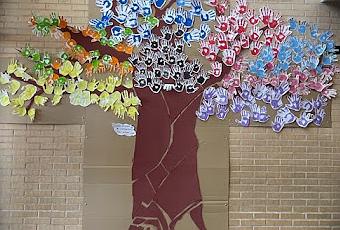 Las hojas de este árbol corresponden a las huellas de las manos de los niños, pintadas con distintos colores para representar a todos esos cuidadores, que son fundamentales en el apoyo de los niños con cáncer.