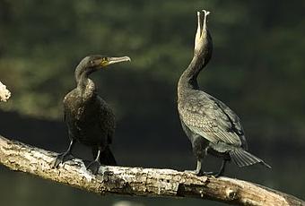 Pero el tronco semisumergido no es sólo un lugar de reposo y de acicalamiento. Las interacciones sociales son frecuentes y no es raro observar comportamientos amenazantes y de dominancia entre las distintas aves que allí se congregan. Asimismo, y tengo que admitir que fue un comportamiento que me sorprendió, el sábado pasado mientras me encontraba escondido observando el posadero, pude ver a una pareja de cormoranes desarrollando un ritual típico de parada nupcial, con frecuentes acicalamientos mutuos, picoteos y exhibiciones. Los cormoranes grandes no se reproducen en Asturias y de todas formas aun faltan varios meses para que comience la cría por lo que estos comportamientos probablemente sirvan para mantener el vínculo entre los dos miembros de la pareja.