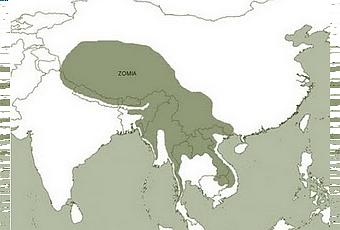 La zona coloreada del mapa es "Zomia", un término acuñado por el historiador holandés Willem van Schendel en 2002 para designar la vasta y no demasiado conocida área geográfica del sureste asiático donde sobreviven muchas de las últimas sociedades sin estado del planeta. El área abarca hasta 2.5 millones de kilómetros cuadrados entre Chinia, India y Bangladesh donde habitarían unas 80 millones de personas pertenecientes a cientas de etnias diferentes, viviendo a una altitud entre 200 y 4.000 metros. Zomia ("Gente de las montañas") no designa una identidad política, sino un continuo de pueblos montañeses que comparten sistemas de oragnizacion social y ecológica en contraste sistemático con el tipo de organización basado en el estado y la agricultura sedentaria, característico de los valles asiáticos administrados por el estado.