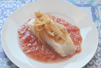 Para emplatar, poner la mermelada de tomate en la base del plato. Colocar el bacalao y encima la cebolla caramelizada.