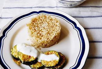 Ingredientes para 2 personas- 1 calabacin.- Queso parmesano- Tomillo- Romero.- Sal- Pimienta.Ingredientes para la salsa de yogur- Un yogur griego.- Cilantro picado- Un diente de ajo.- Aceite de oliva virgen extra.- Zumo de limón.- Sal.