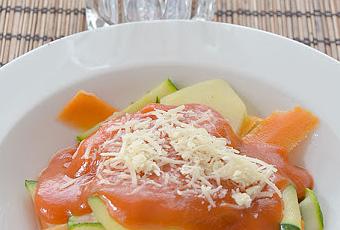 Ingredientes- 2 zanahorias.- 1 calabacín.- 1 patata.- Sal.- Tomate frito.- Queso rallado (opcional).