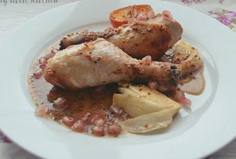 En un cuenco grande poner el zumo de naranja, el zumo de limón, el azúcar moreno, la mostaza en grano, la sal , el aceite de oliva y el jengibre y remover bien.Cortar el bulbo de hinojo de tal forma que queden cuatro gajos y añadirlo a la mezcla anterior. Partir por la mitad las mandarinas y ponerlas en la mezcla y añadir el pollo. Mezclar todo bien y dejar macerar toda la noche en la nevera.Pasado el tiempo disponer todo en una bandeja resistente al calor y hornear a 180º unos 35 minutos.Sacar el pollo, el hinojo y las mandarinas y mantenerlo caliente y poner la salsa en un cazo. Llevar a ebullición suave y dejar que reduzca a la mitad.Emplatar el pollo con el caldo reducido y decorar con unos granos de granada.