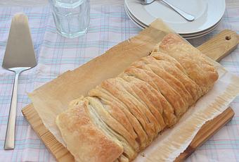Estirar la masa de hojaldre y dividirlo mentalmente en tres partes. En la parte del centro colocar el relleno y los extremos cortarlos en tiras. Colocar encima de las verduras y el pollo el jamón de york y el queso e ir superponiendo las tiras de hojaldre por encima hasta cerrarlo.