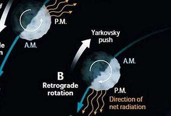 Efecto Yarkovsky, según la rotación del asteroide se ve afectado su movimiento por este efecto. Gráfico de Sky-telescope