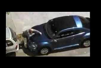 En las imágenes que difundió Todo Noticias se ve cómo el agresor sale de su garaje y arremete contra el Volkswagen Beetle color azul oscuro. Lo patea primero hasta abollarlo, le rompe los espejos retrovisores y le raya las puertas y el capot, donde le dejó marcado el símbolo de “prohibido estacionar”.