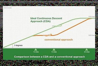 Se denomina sistema CDA a volar en descenso continuo. Permite disminuir la contaminación ambiental y acústica gracias a sistemas de pre-planificación. Empresas del sector están desarrollando su propio sistema de aproximación en descenso continuo, también conocido como "aproximación verde" o "aterrizaje verde" o ecológico como una de las mejores medidas de disminución del gasto de combustible.