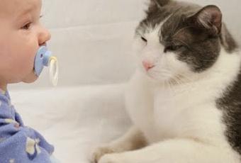 Familiarizar el gato con los sonidos de un bebé genera otro tipo de reto. Sobre todo si el gato no ha tenido nunca contacto con niños pequeños, es importante que se acostumbre a la grabación del lloro de un bebé. Esta grabación se debería poner con volumen bajo mientras el propietario juega con el gato o le da golosinas. Cuando el gato deja de prestar atención al sonido nuevo, se repite el ejercicio subiendo gradualmente la intensidad de la grabación hasta el volumen alcanzado por un bebé llorando.