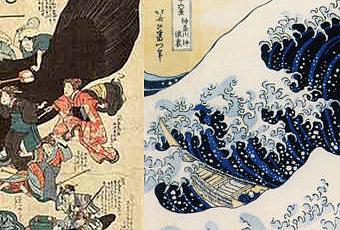 Pictografías del folklore japonés mostrando la leyenda del pez gato (namazu) que con su movimiento provoca los terremotos (Earthquakes and Animals, World Scientific, Motoji Ikeya) y La gran ola de Kangawa (KatsushikaHokusai, 1829-1832.