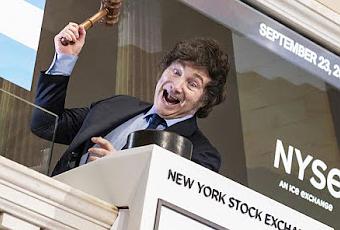 El presidente argentino Javier Milei, durante su visita a la Bolsa de Nueva York (NYSE), tocando la