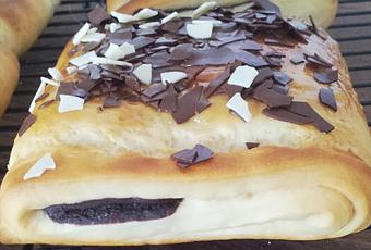 Precalentamos el horno 200ºC calor arriba y abajo. Extendemos la masa de hojaldre sobre el papel de hornear que trae, y echamos la crema de chocolate sólo en el centro, estiramos con una espátula o cuchara. Ahora llevamos uno de los lados del hojaldre hasta cubrir la crema de chocolate y luego el otro extremo hasta el otro borde hasta cerrar la napolitana. Le damos la vuelta para que la doblez quede hacia abajo y no se abra en el horno. Cortamos las napolitanas según el tamaño que nos guste, incluso podemos hacer mini napolitanas. Las llevamos con ese mismo papel al horno y lo tendremos unos 15 minutos (esto dependerá de cada horno, como siempre, hay que estar pendientes). Cuando ya las veamos doradas, las sacamos y dejamos sobre una rejilla. Calentamos la mermelada de melocotón unos segundos en el microondas, y con una brocha, pintamos la superficie de las napolitanas, a continuación, echaremos las virutas de chocolate o fideos, lo que tengáis más a mano. Una vez frías, a disfrutar de esta merienda tan rica.