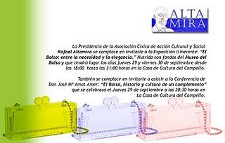La Asociación Cultural "Rafael Altamira" de Campello, invitó al Museo del Bolso a realizar una exposición en la Casa de Cultura de Campello (Alicante), además de impartir una conferencia a cargo de José María Amat, Director Técnico del Museo, sobre "La Historia del Bolso". Elaboraron un díptico para anunciar los eventos y unos pasquines.