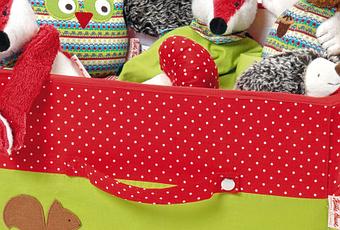 Esta completa colección de vivos colores, donde predomina el verde luminoso y los detalles en rojo, es ideal para bebés de 0-24 meses y también para bebés a partir de un año. Incluye muñecos de rasgos delicados y simples, mantas de juegos y cubrecamas, sonajeros musicales, cojines, móviles, libros de actividades, mordedores, cadena para chupetes, colgante para cochecitos, caja para juguetes y un sinfín de artículos. Así, los personajes del bosque podrán acompañar al bebé en su habitación, en el salón y también cuando salgan juntos de paseo.