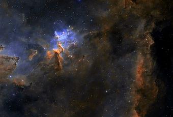 ¿Qué es lo que hay dentro de la nebulosa del Corazón? La enorme nebulosa de emisión llamada IC 1805 parece, en conjunto, un corazón humano. La nebulosa brilla intensamente en luz roja emitida por el hidrógeno, el elemento preponderante. El resplandor y la forma han sido creadas por un pequeño grupo de estrellas que hay cerca del centro de la nebulosa. En el centro de la nebulosa del Corazón hay estrellas jóvenes del cúmulo estelar abierto Melotte 15 que están erosionando varios pilares de polvo con su energética luz y sus vientos. Este cúmulo abierto de estrellas contiene algunas estrellas brillantes de unas 50 veces la masa del Sol, numerosas estrellas tenues de sólo una fracción de la masa del Sol, y un microcuásar ausente que fue expulsado hace millones de años.