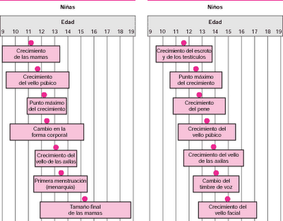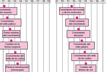 Durante la pubertad , el desarrollo sexual tiene una secuencia preestablecida. El momento del comienzo varía de una persona a otra. El círculo rojo indica el promedio de edad en el que se realiza el cambio.