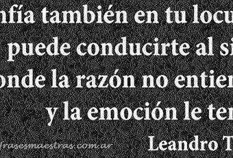 Si algo es una verdad en este mundo es que muchas veces la mejor opción es escuchar a la locura, pues esta nos puede llevar a lugares en los cuales las emociones sienten temor y la razón no comprende, lugares que son desconocidos para todo conocimiento que poseemos, y como sabemos los seres humanos siempre tememos a lo desconocido.A veces la locura es lo único a lo que podemos recurrir, pues si algo es bello de la locura es que esta no esta aferrada a la realidad, es que su falta de razón nos puede ayudar a no escuchar nuestros temores internos, la locura nos ayuda a oírnos a nosotros mismos y al tiempo a no escuchar a fariseos, la locura nos es siempre necesaria para encontrar nuestras pasiones.El camino de la locura no es perfecto, requiere correr muchos riesgos, puede generar soledad, puede confundirnos en gran medida, pero siempre será necesario tomarlo para que los temores y la razón no estanquen nuestra vida, es mejor correr el riesgo de la locura que vivir siempre aferrado a la realidad casi siempre negativa para nosotros.
