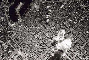 Esta foto de la aviación italiana, que especifica día, hora y lugar del bombardeo, muestra la diferencia entre la explosión de la bomba-camión y las del resto de las bombas