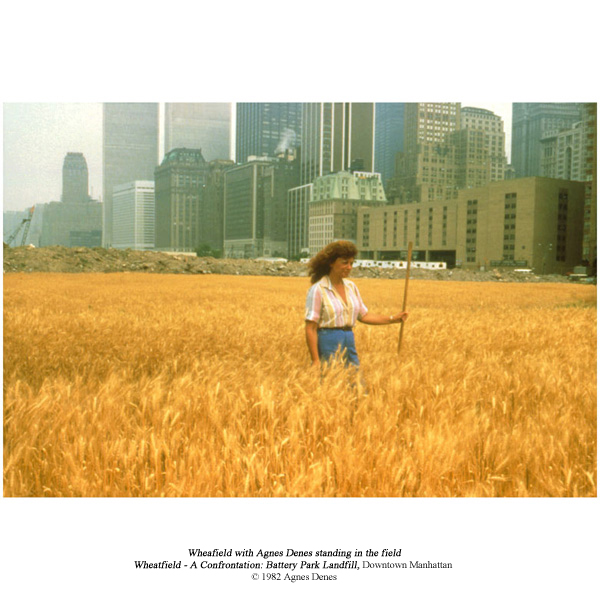 También dice que el éxito del espacio como lugar de convocatorias o manifestaciones fue tal que se creó un programa de instalaciones temporales y actuaciones específicas del sitio, llamado «arte en la playa», que atrajo visitantes 1977 hasta 1985. Una de las que menciona y que más me ha llamado la atención la llevó a cabo la artista y activista Agnes Denes creado un campo de trigo 2 hectáreas en el relleno a pocos metros de Wall Street y el World Trade Center con el objetivo de llamar la atención sobre el despilfarro y las preocupaciones ecológicas. Sobre la acción, además de realizar las fotografías, Agnes Denes escribió esto en 1982:
