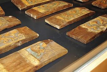 Este fragmento de un paño de arrocabe está fechado en el siglo XIV y está fabricad en madera de pino policromada.